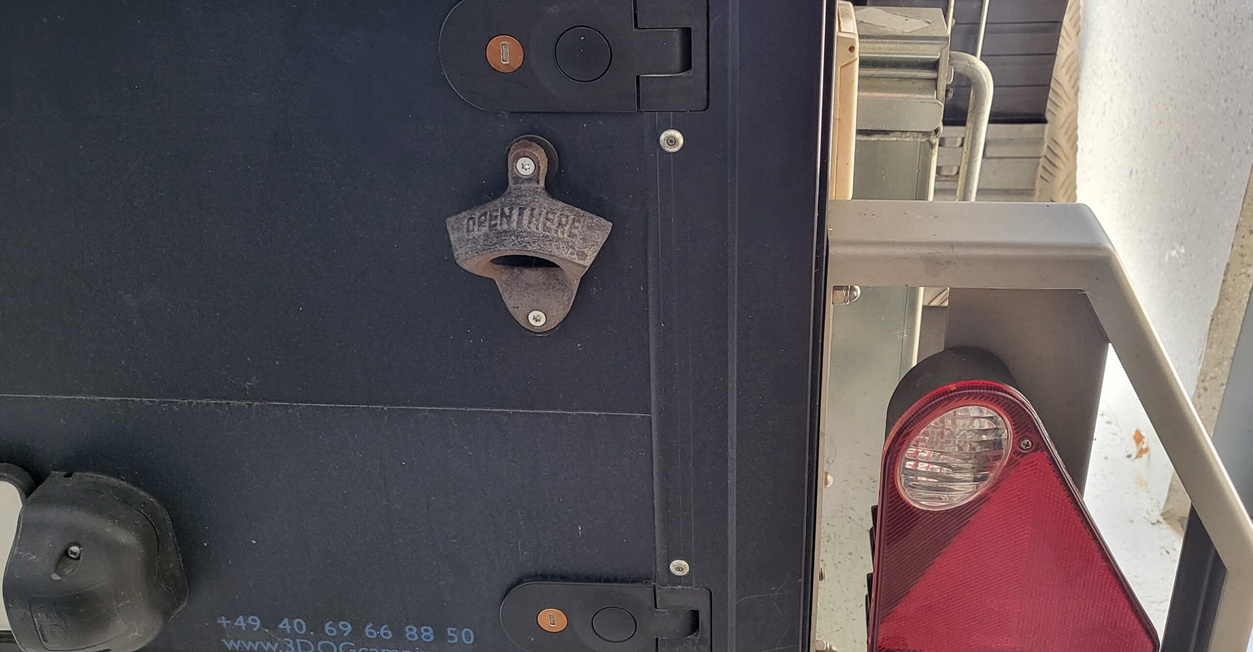 Flaschenöffner aus Guss an der Ladebordwand hinten außen