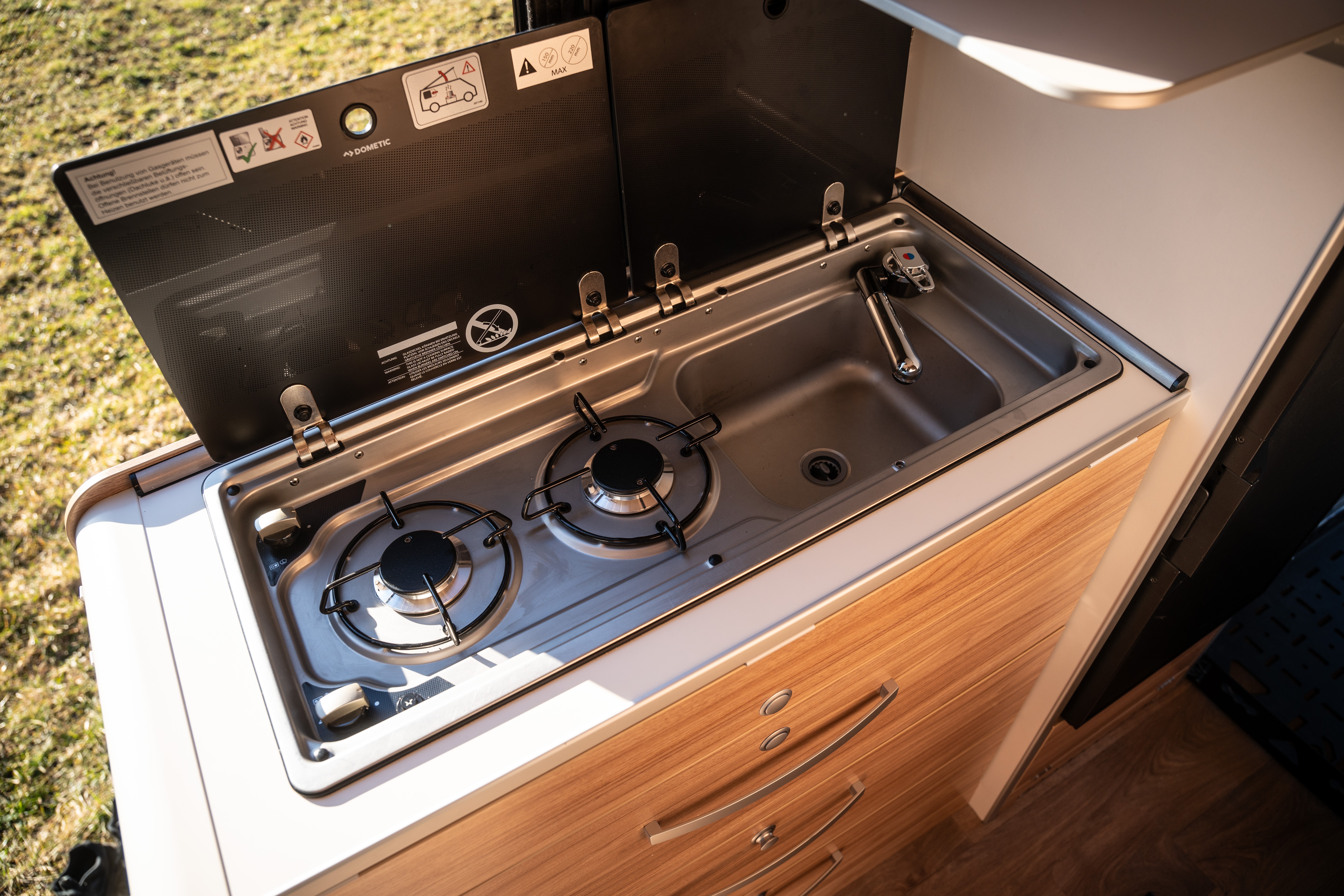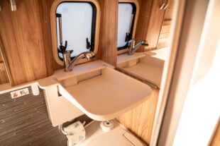 – Edelstahl-Campingtisch mit praktischer Anbringung unter dem Bett, eingebaut und gekauft von CREAVANS