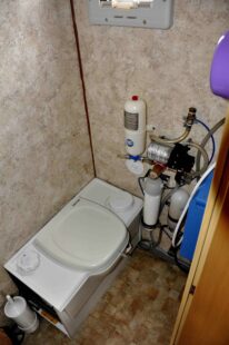 ▪ Thetford Chemie Kassetten WC (von außen zu leeren); Waschbecken mit Spiegelschrank