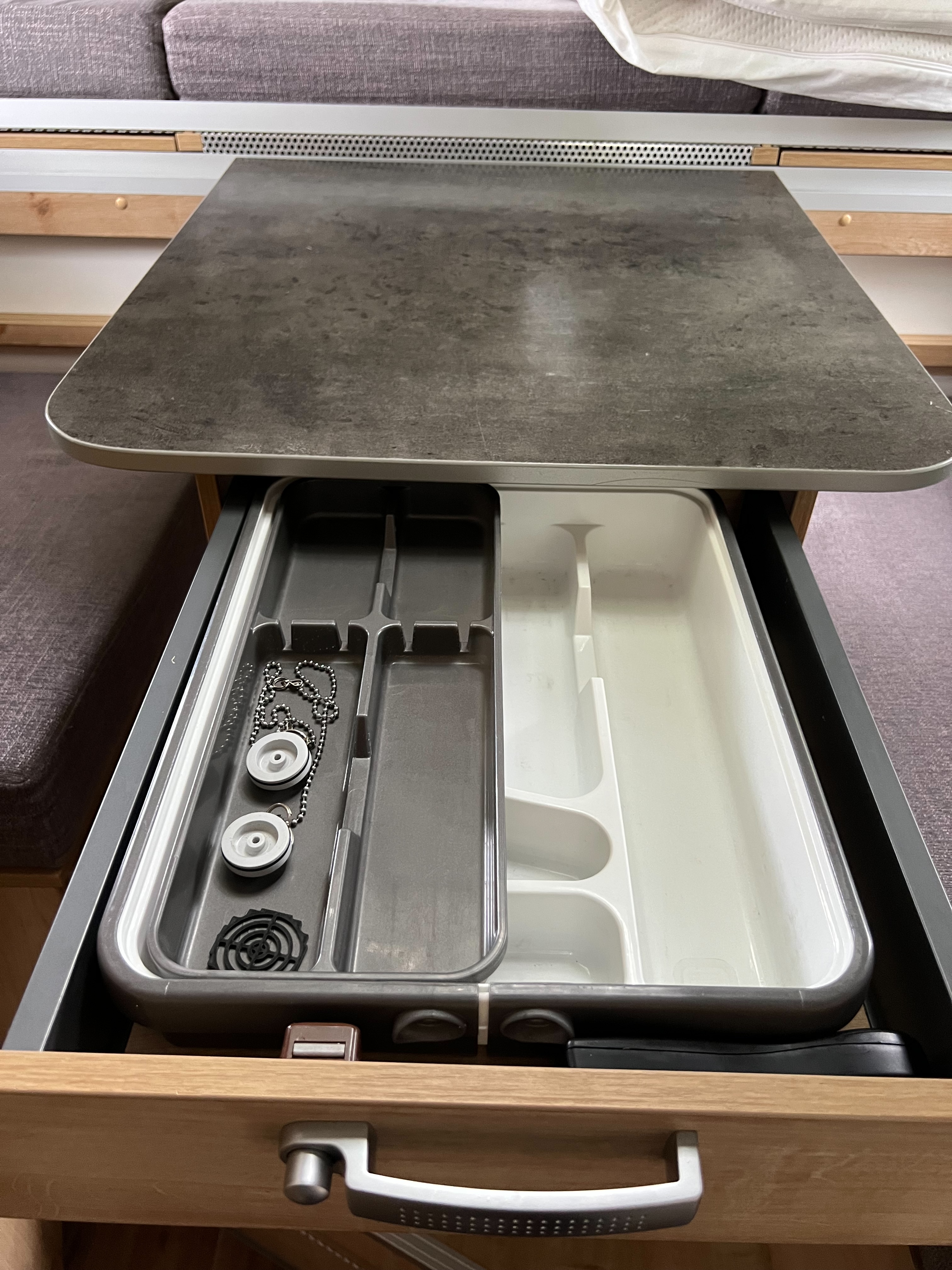 – Den original Fahrradträger der Fa. Burow haben wir abgeändert, so dass die Alubox separat an den Airlineschienen der Kabine befestigt ist. So kann der Träger für die Räder entfernt werden und die Box dient weiterhin als Stauraum.