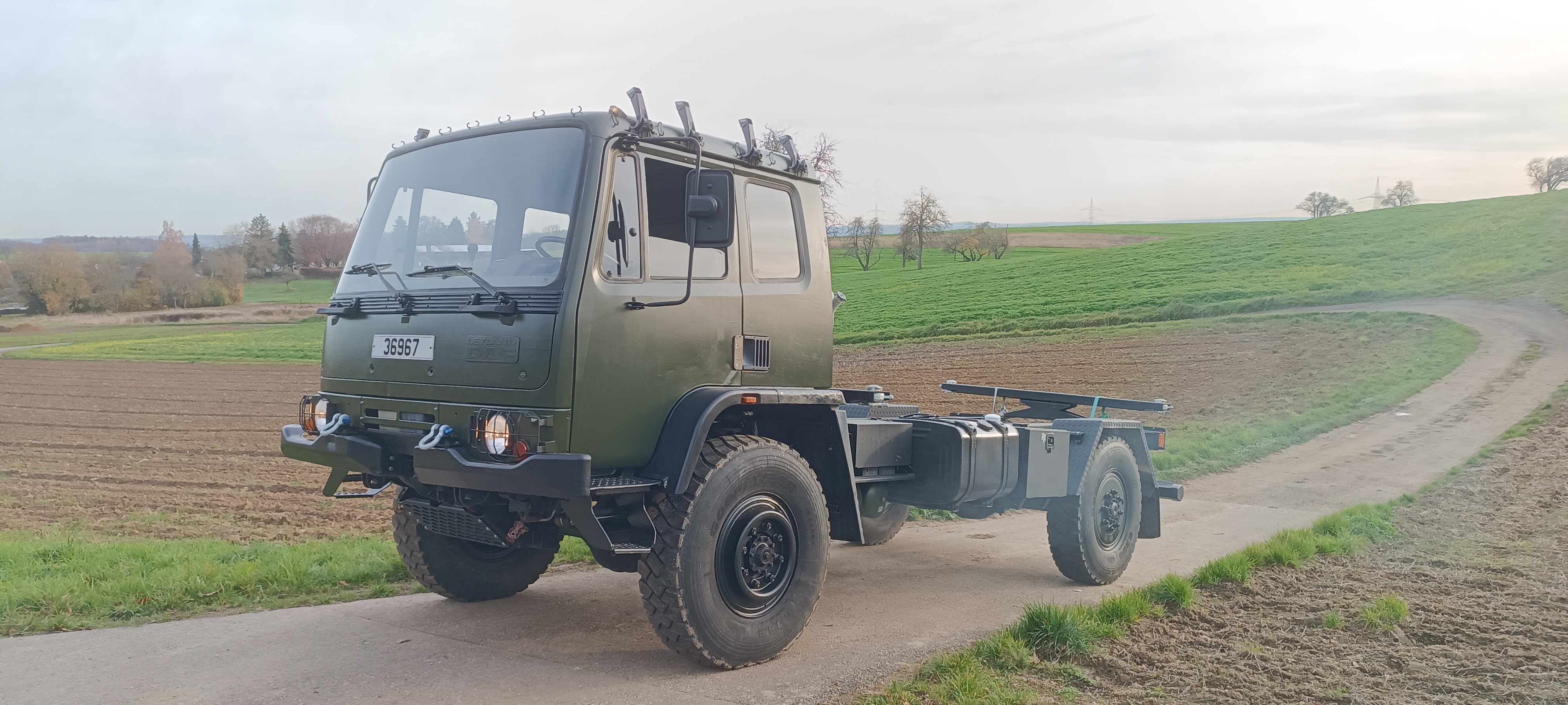 Zum Verkauf steht ein hervorragend erhaltener DAF Leyland T244, ausgestattet als 4×4-Fahrgestell mit einem neu aufgebauten, verschränkbaren Wechselrahmen für FM2-Kabinen (z. B. Zeppelin, Dornier). Der Wechselrahmen verfügt vorn über ein Festlager und am Heck über ein Drehpunktlager. Somit gleicht er sämtliche Rahmenverwindungen souverän aus – perfekt für Expeditionen und Offroad-Reisen.