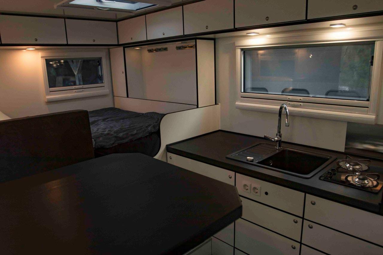 Schlafen: Querbett im Heck, Sitzgruppe umbaubar, Zusatzbett im Fahrerhaus.