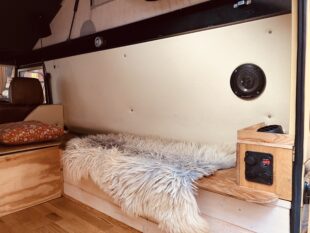 Einfacher Innenausbau in Holz mit Staufächern, PortaPotti sauber untergebracht