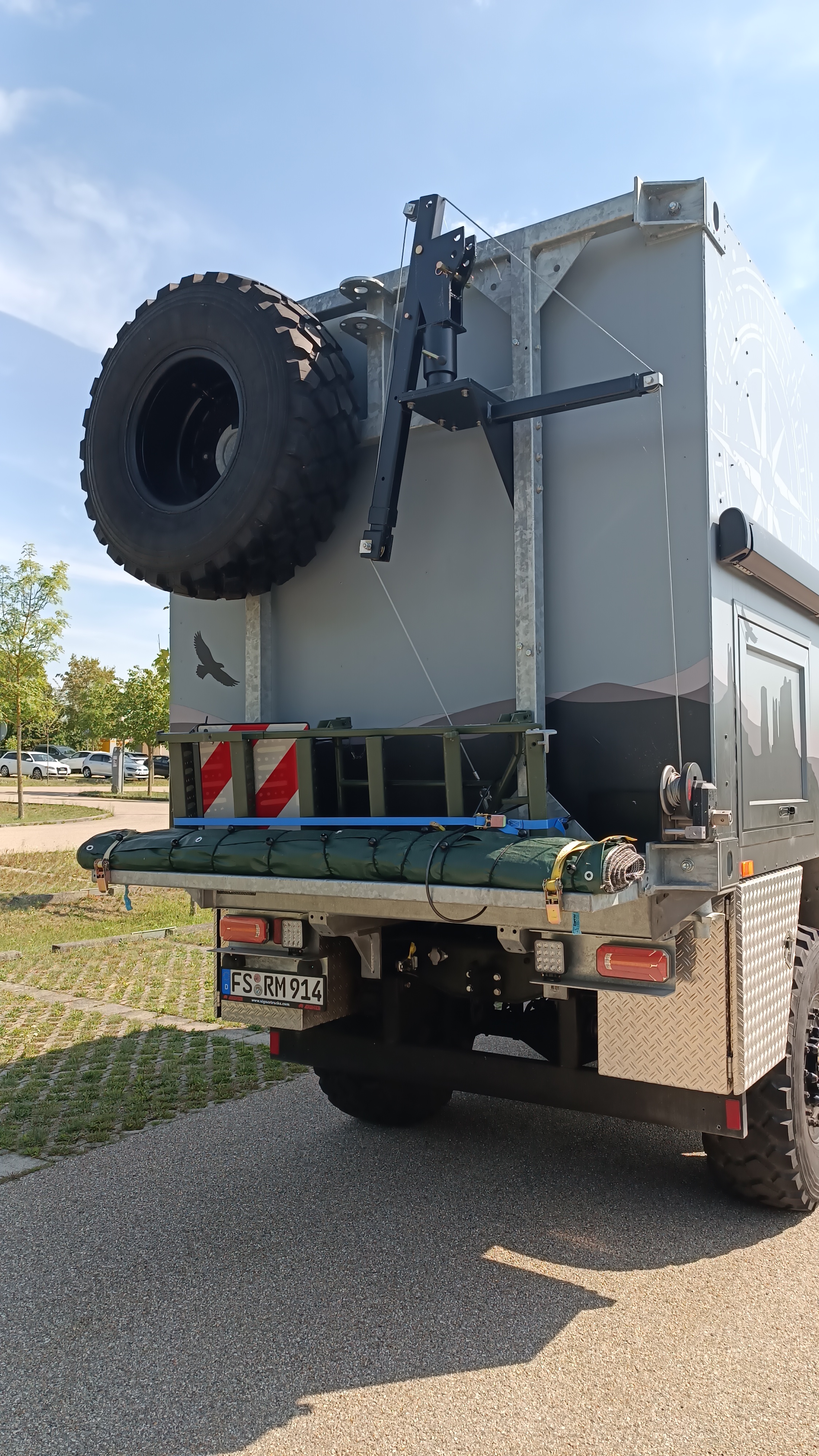 Heckträger / Seilwinde am Heck für Reifen etc. / Schwerlastauszug für Euroboxen im Staufach / 2 Recorositze Luftgefedert