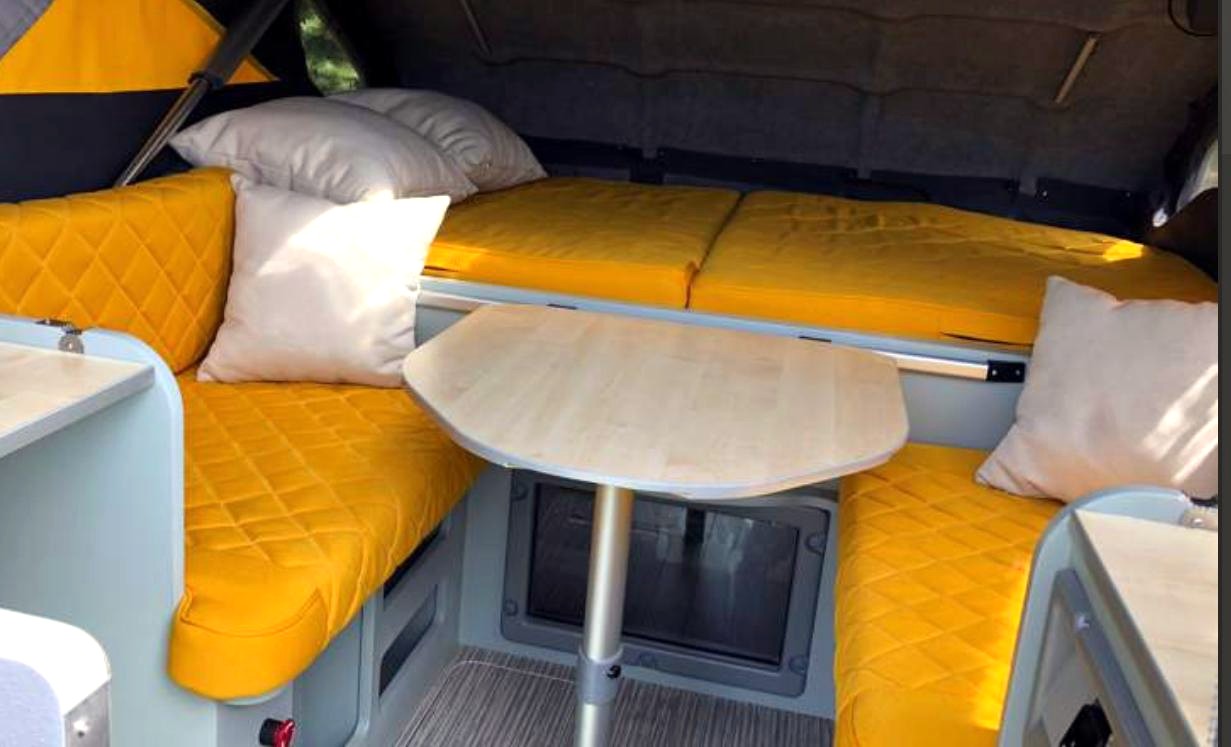 - Querschläfer-Doppelbett (195 x 125 cm). Polster und Tuchent können auch bei eingeklappter Kabine liegen bleiben!