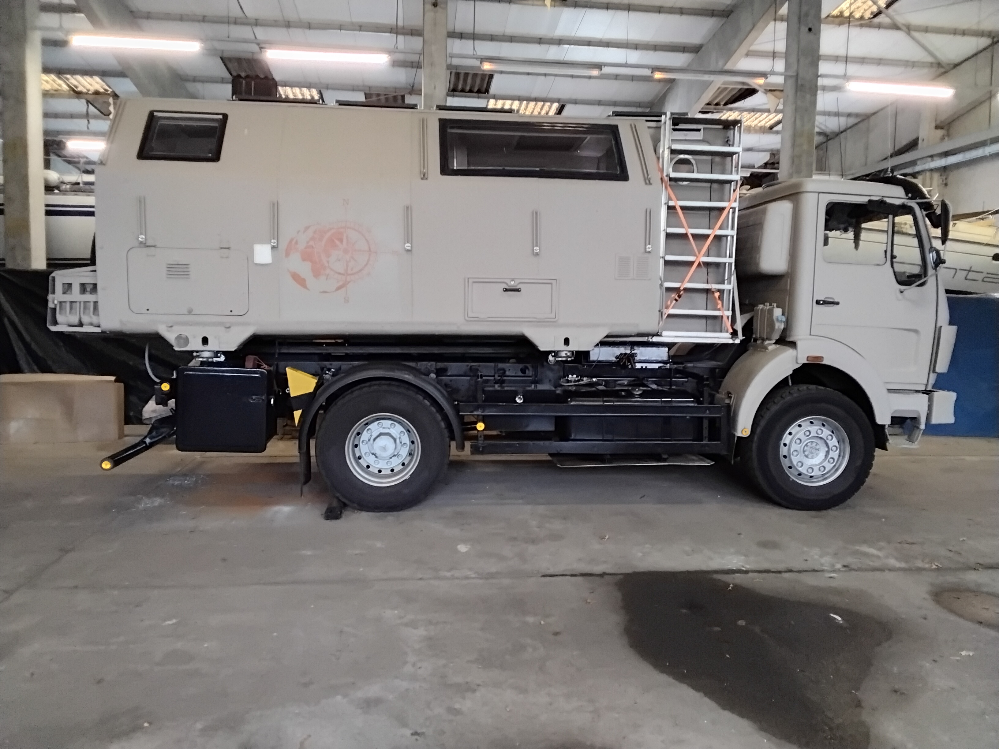 Baujahr 1987 ( mit H- Zulassung); TÜV 8/26, 6 ZYLINDER 176PS; 5 Gang Allrad; 24 V Bordnetz mit 2 neuen Batterien, Bereifung 385/65 R 22.5 Baustellenprofil auf Stahlfelge; Führerhaus bis auf die Rückwand( wegen event. Notdurchgang) mit 32mm Armaflexdämmung gedämmt; 400l Dieseltank mit zusätzlichem Dieselfilter und Aufreissschutz; 2 kleine Staukisten für Kabel usw, 1 grosse Staukiste – Aussenküche mit einem 2 Flammengaskocher und 2x 5l Gasflaschen, 1 grosse Staukiste für Werkzueg und Zubehör, 1 Staukiste für ein 40T Luftkissen und Reifenmontagewerkzeug; Reserverad, 1 Sandblech & 2 Halterungen für 4 20l Kanister am Koffer befestigt; es gibt noch eine AHK zur Montage am Heckunterfahrschutz zu Nutzung eines Fahradträgers.