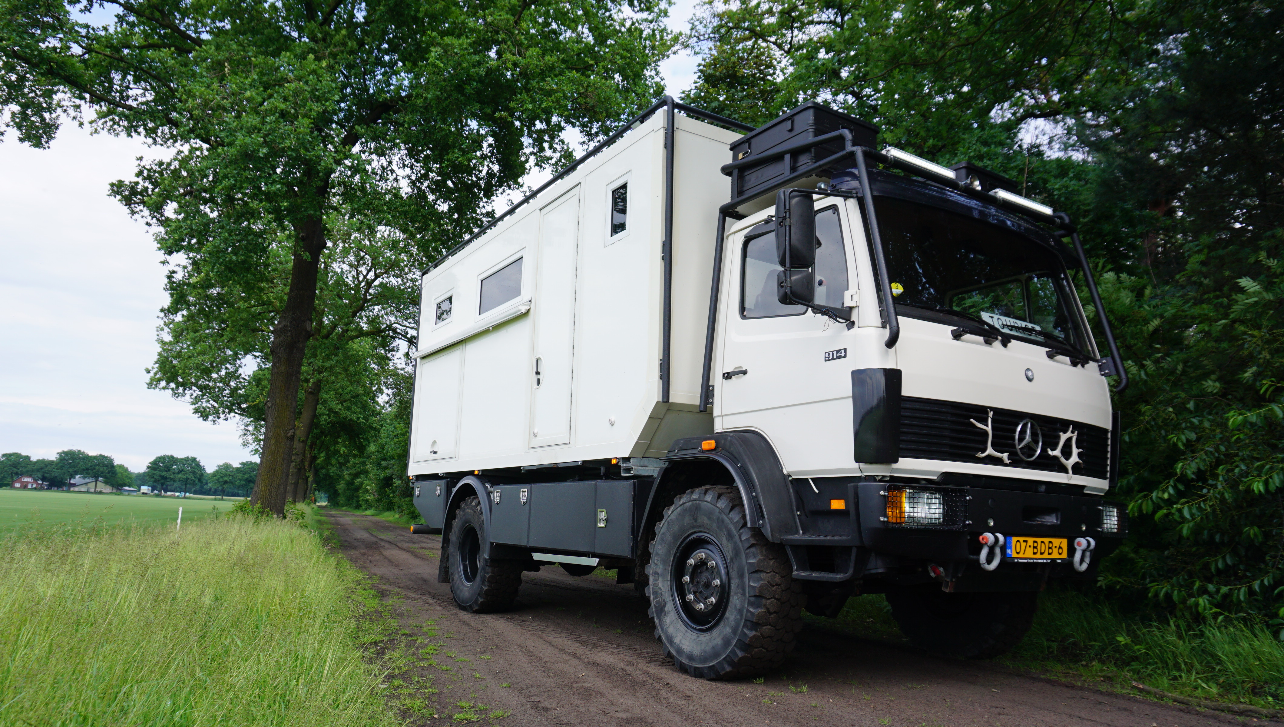 Der Lkw hat ein Sperrdifferenzial hinten und eine Mittelsperre, 4×4, Sandplatten und Dachboxen, Astschutz für Sonnenkollektoren und Scheinwerfer sowie Beleuchtung rund um das Fahrzeug, die von der Wohnkabine aus bedient werden kann