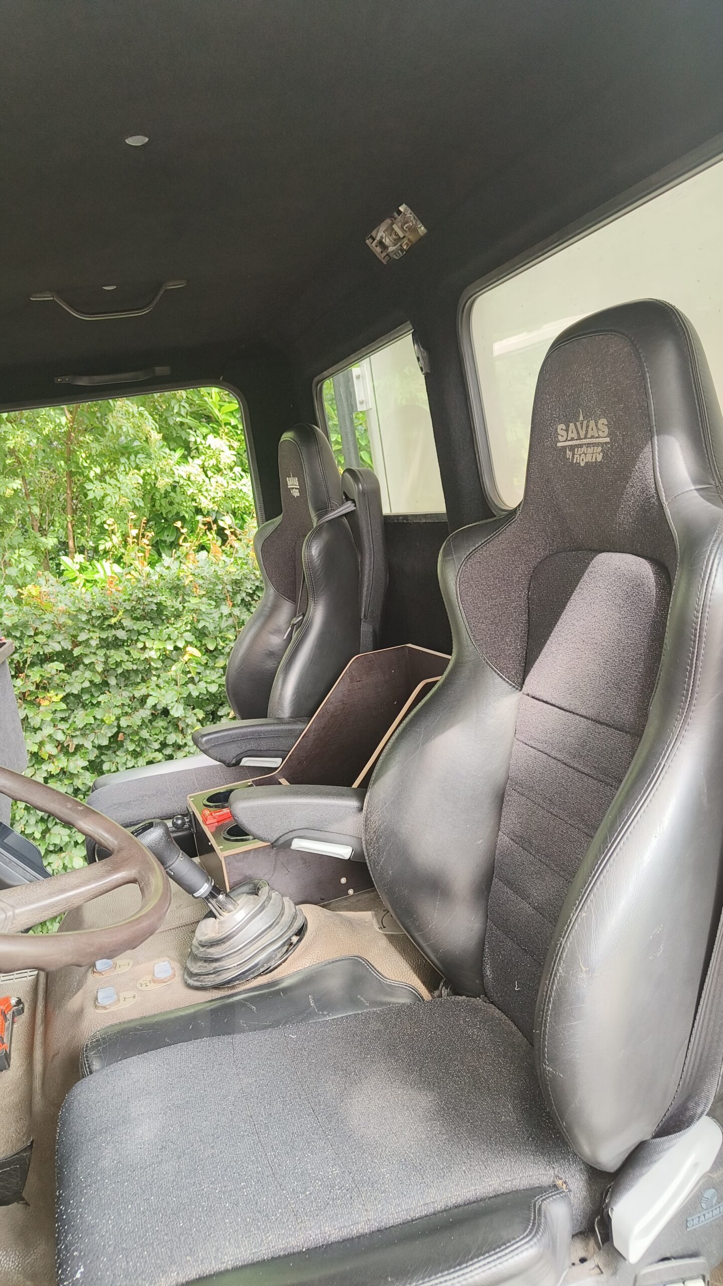 Die Kabine verfügt über alle Annehmlichkeiten wie Rückfahrkamera, Isolierung, damit man sich normal unterhalten kann, 2x luftgefederte Sitze und in der Mitte ein Kartenschrank mit Getränkehaltern, Radio, Tankanzeigen und ausreichend USB-Anschlüssen.