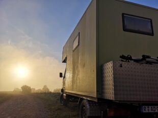 Leichtbaukabine mit Wabensandwichplatten der Fa. Paneeltec aus Thüringen. Zwischenrahmen aus Aluminium berechnet und gefertigt von einer Firma für Sondermaschinenbau. Kabine könnte bei Bedarf sehr leicht abgenommen und auf ein anderes Fahrzeug umgesetzt werden. Gemütlicher Wohnraum mit sehr gutem Raumgefühl. Masse der Kabine: Länge mit Alkofen 430 cm, ohne Alkofen 310 cm, Breite 202 cm, Höhe 215 cm. 4 Schlafplätze, 2 im Alkofen und 2 in der Hecksitzgruppe. Einstieg mit simpler Verstaumöglichkeit der Treppe unter der Wohnkabine in Führungsschienen. Rechts vom Einstieg Eckschrank mit Aufstiegsstufen zum Alkofen. Matratze des Alkofen auf Tellerfedern. Alkofen und alle Möbel unterlüftet. Durchgang zur Fahrerkabine. Auf der gegenüberliegenden Seite Trockentrenntoilette. Anschließend Küche mit Waschbecken und original Origo Spirituskocher. Engel Kompressorkühlbox auf Schwerlastauszug. Diverse Schubladen und Schränkchen für Lebensmittel, Kochgeschirr und Besteck. Erhöhte Hecksitzgruppe mit Schuhstaufach unter dem Tischbereich. Im rechten Teil der Hecksitzgruppe Wassertanks mit zur Zeit 4×30 ltr. modular erweiterbar. Im hinteren Teil über die ganze Breite Heckgarage mit enorm viel Stauraum. Im linken Teil der Hecksitzgruppe Elektrik. Der Tisch kann in der Höhe verstellt und sowohl gedreht als auch verschoben werden. Dadurch ist die Sitzecke sehr unterschiedlich nutzbar und der Tisch kann auch als zusätzliche Arbeitsfläche beim Kochen genutzt werden. Sitzpolster Schaumstoff, Rückenlehnen Filz mit Schafwollfüllung. Oberhalb der kompletten Sitzgruppe Staufächer. Anschließend, links vom Eingang Holzschränkchen mit etlichen Schüben.
