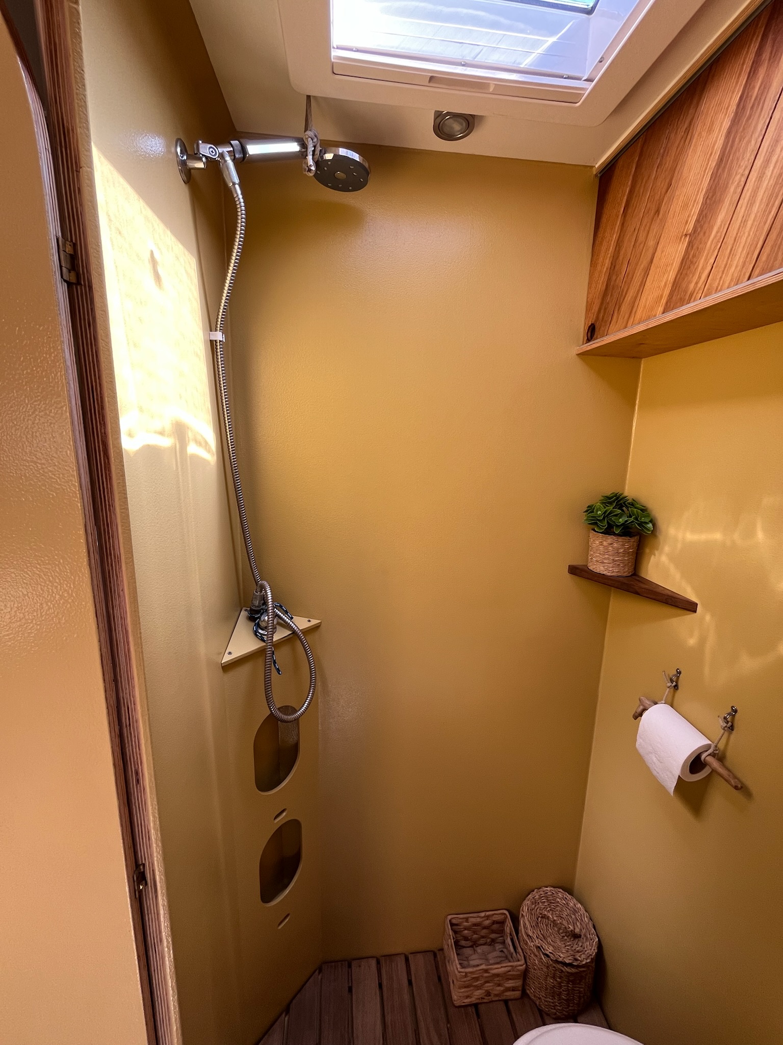 Innen-Duschkabine (im Toilettenbereich). Außerdem Warmwasserdusche im Außenbereich.
