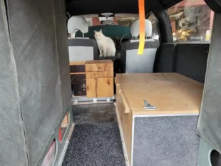 Innenausstattung neu mit Alcantara und Leder, Campingausbau, viel Stauraum, Unterflurkofferraum wo einst das Reserverad war.