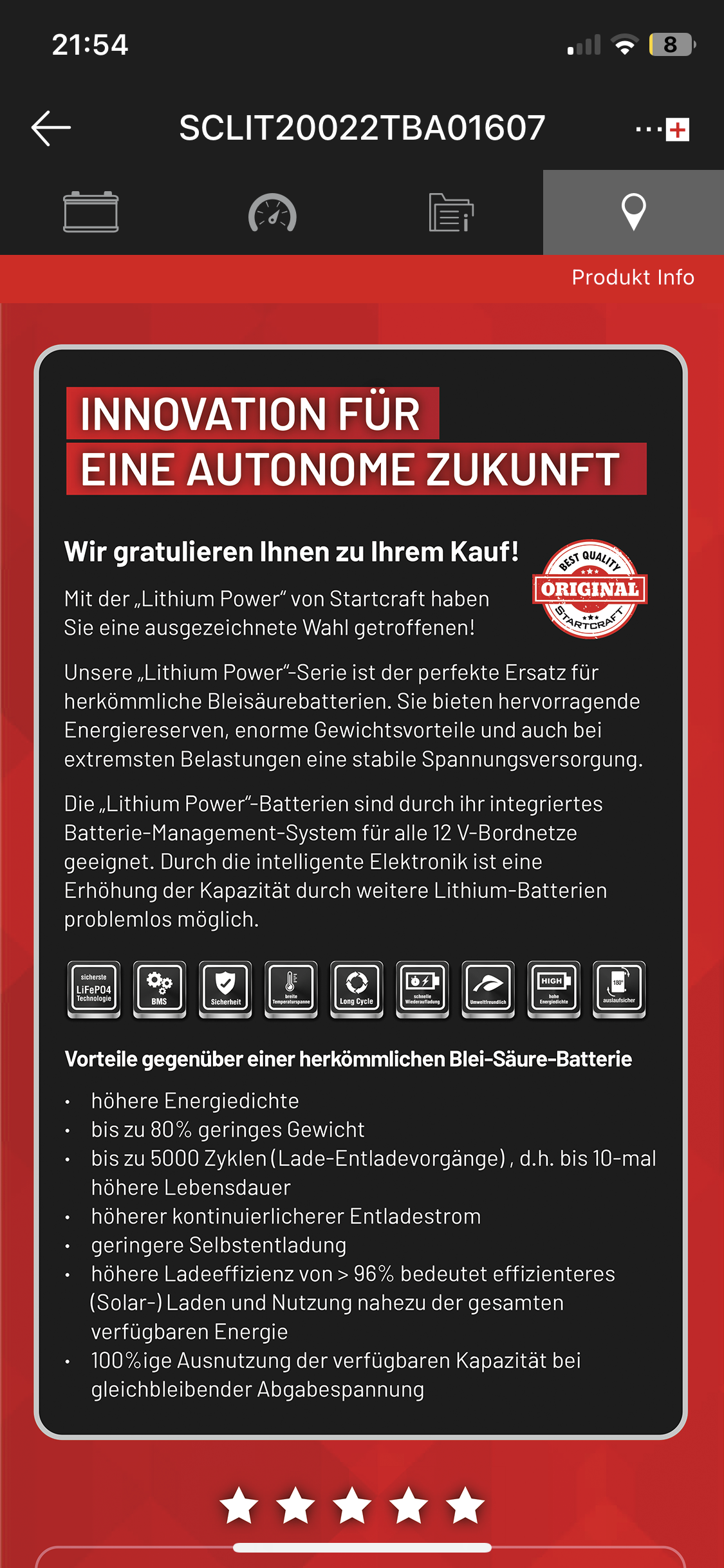 Der Akku hat mich auf zwei Urlaubstouren begleitet und hat dementsprechend kaum Ladezyklen, ist also so gut wie neu. Der Zustand kann den Screenshots der Handy-App entnommen werden (Fotos). Das beschreibt auch gleich ein weiteres Feature: Der Akku kann per App kontrolliert werden.