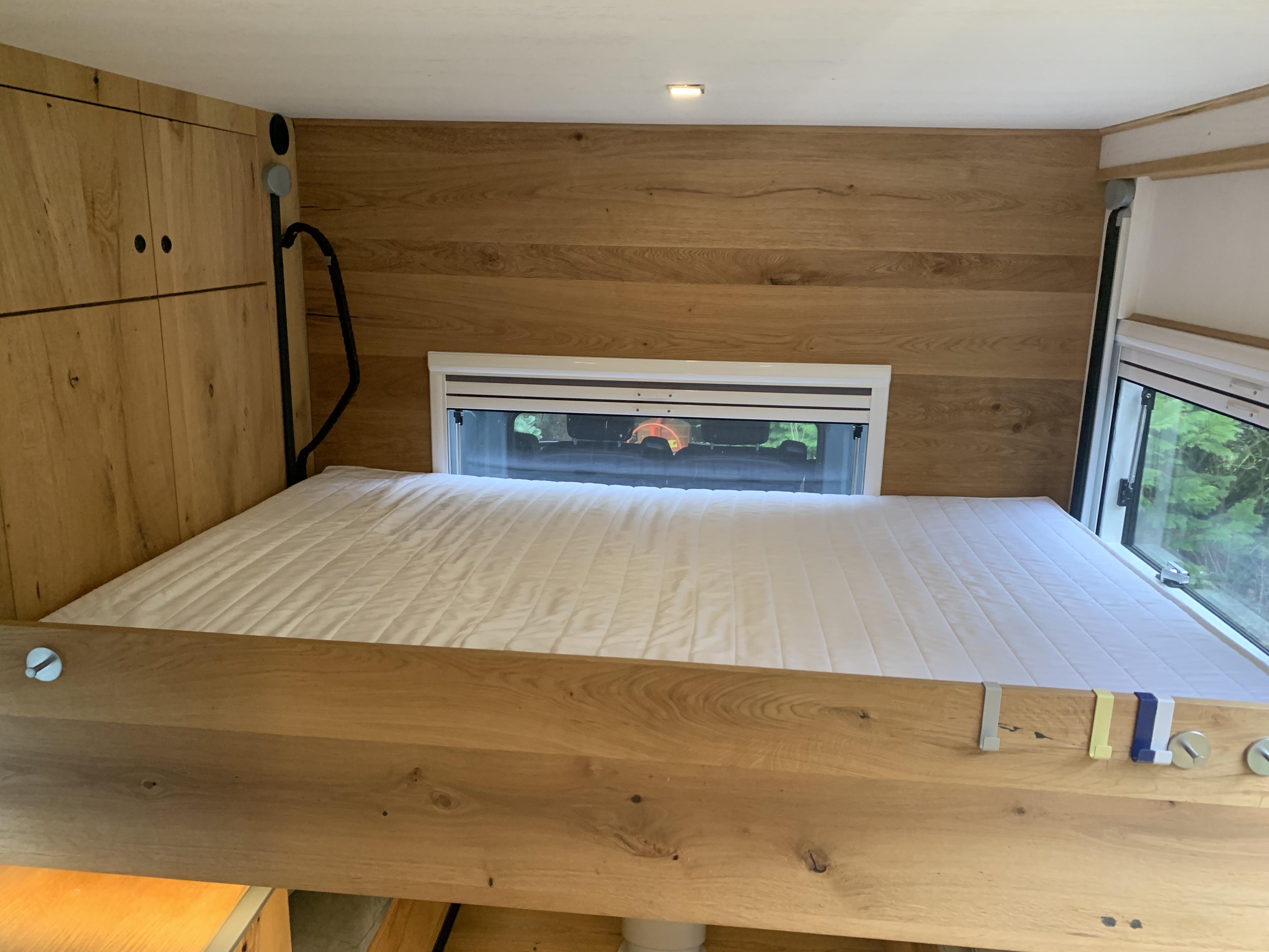 Unser elektrisches Hubbett über der Essgruppe sorgt für genau den Platz den wir brauchten. Ebenfalls ist das Badezimmer längs hinten eingebaut und hat den Clou, dass die Wand klappbar ist und wir damit eine Dusche von 100 x 100 cm haben. Das zweite Bett hat die selben Maße (1,40×2,00 Meter) wie das Hubbett.