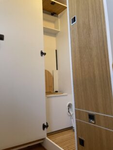 Alles ist aus Leichtbaumaterialien gebaut. Beim Möbelbau wurde auf Leichtbauplatten von EpicPLY gesetzt. Außerdem verleimt, geschraubt und verdübelt mit Flachdübeln. Alles ist durchdacht und bietet mehr Komfort als herkömmliche Wohnkabinen.