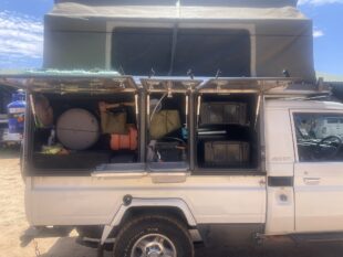 Toyota Landcruiser FZJ79 mit Camperaufbau und nur 214.600 km Laufleistung. Die absetzbare, autarke Kabine hat einen Heckeinstieg und ein seitlich angeschlagenes, von innen begehbares, geräumiges Aufstelldachzelt.