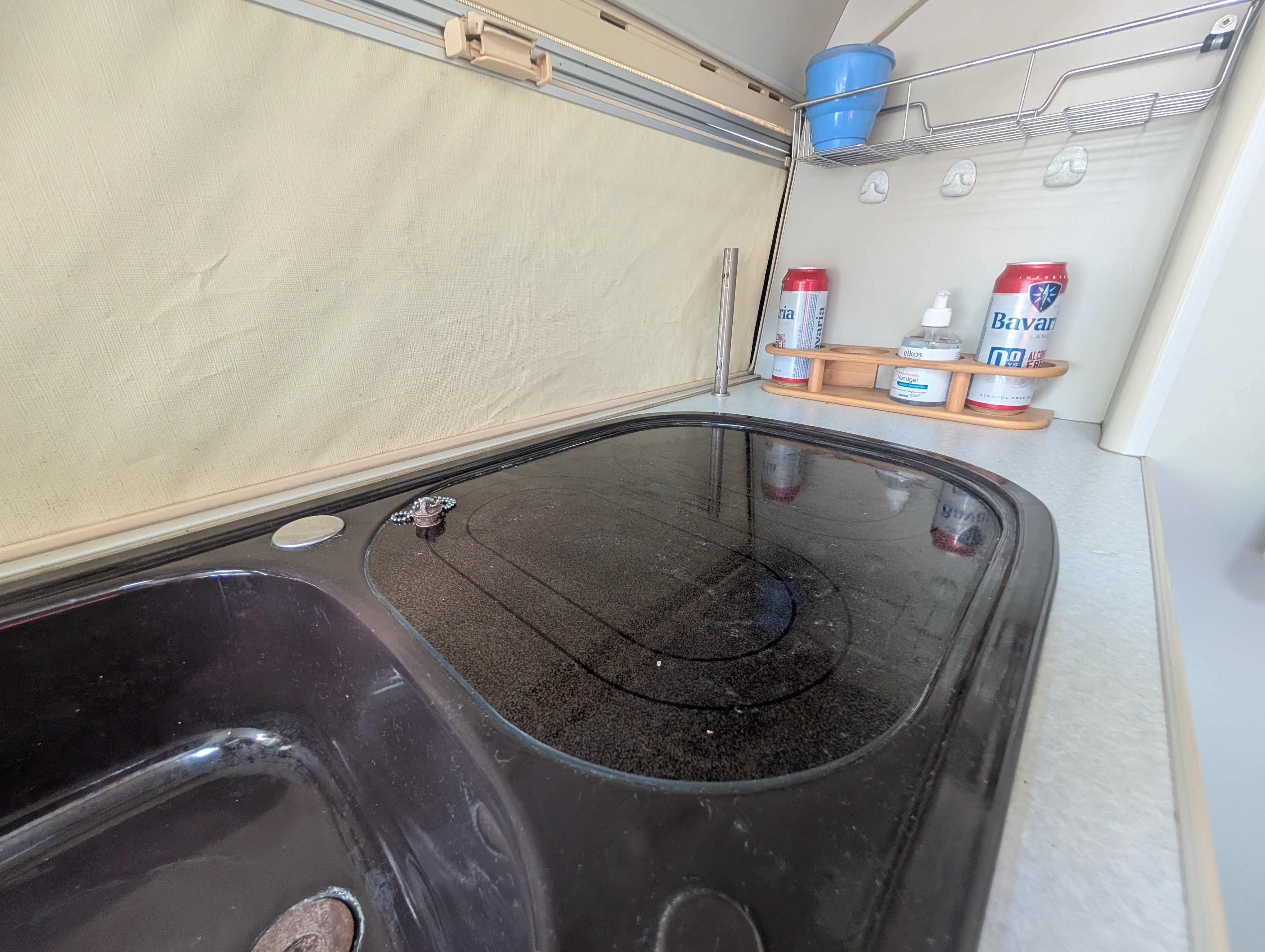 Küche: Ceran-Gaskochfeld, sehr großes Spülbecken, Kühlschrank Gas / 12V / 230V, großzügige Arbeitsfläche, durchdachte Schrankaufteilung.
