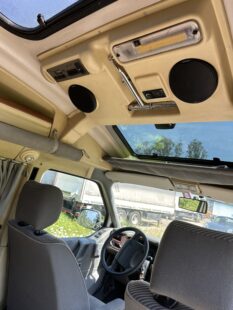 Der Bus hat eine sehr gute Ausstattung mit Klima, Tempomat, elektrischen Fensterhebern, Servolenkung, ZV, DPF Filter für Euro4 mit grüner Plakette. Es sind 180W Solarpaneele fest montiert mit Laderegler und Wandler von Victron. Es gibt einen 6l Warmwasserboiler, eine Sackmarkise und der Bus hat eine feste Anhängerkupplung.