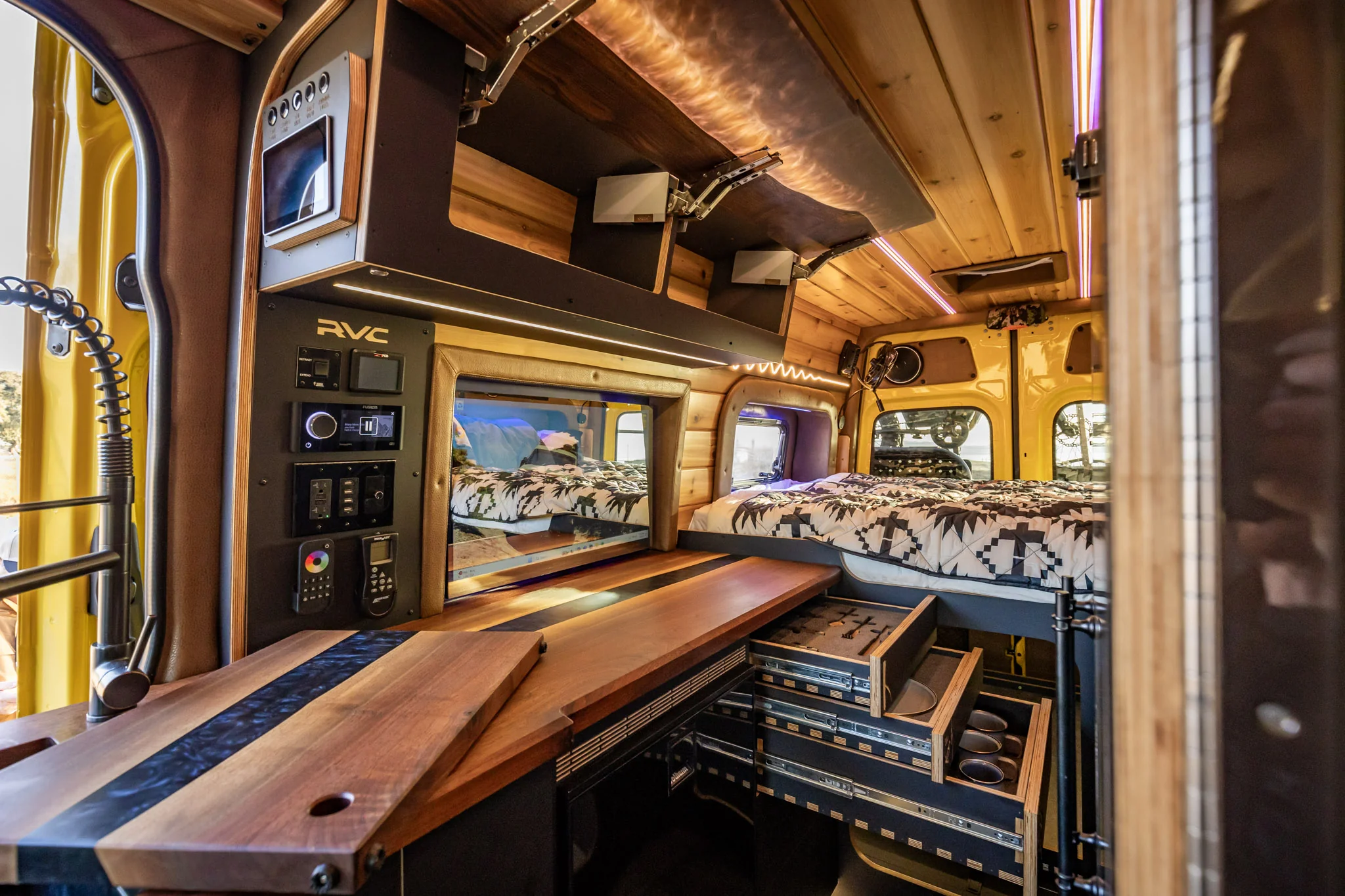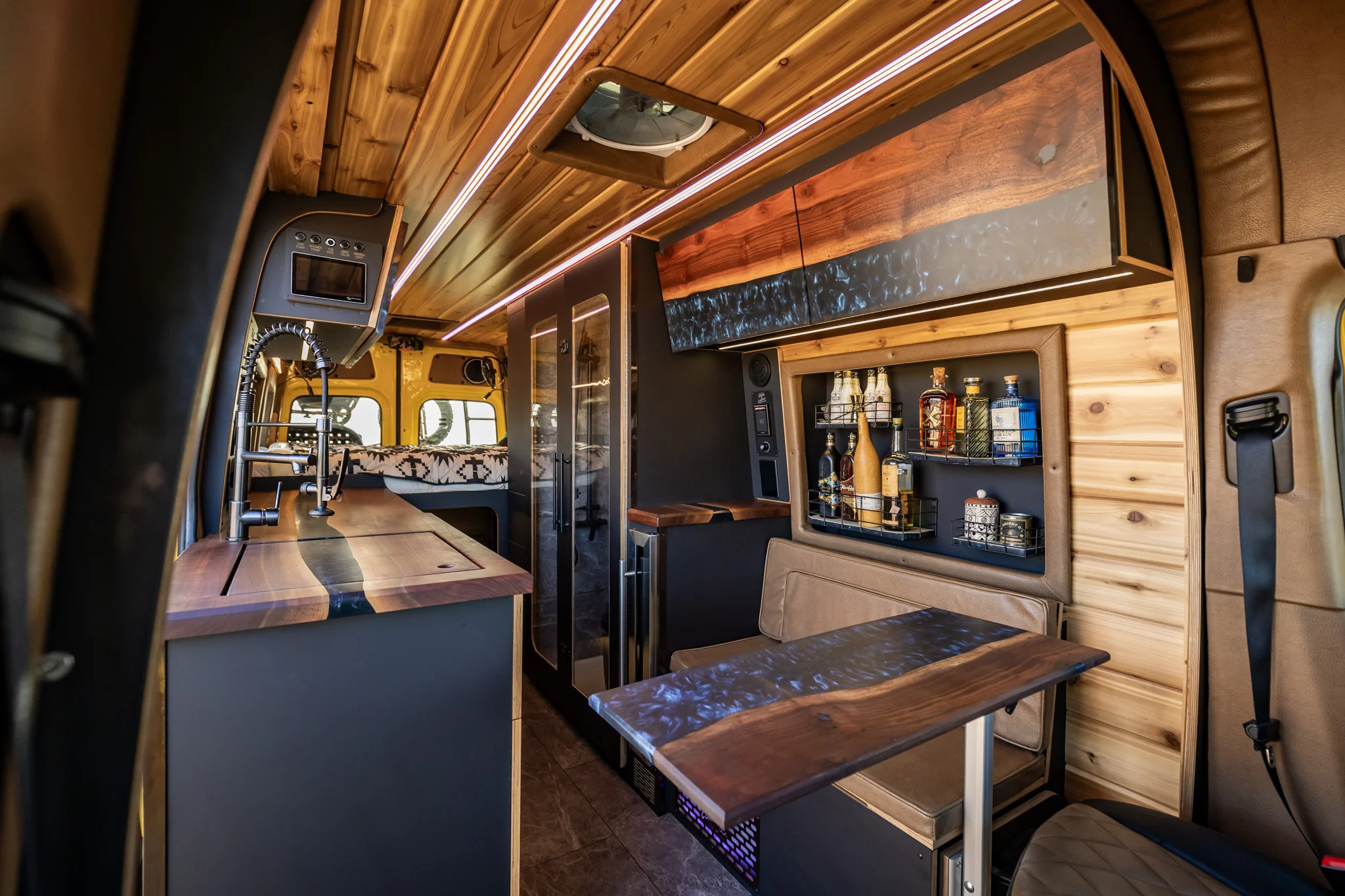 Dass ein Hersteller, der seine Vans gern in Flugzeughangars ablichtet, keinen 08/15-Standard bietet, liegt auf der Hand. Ob die Modelle nun Palisade, Stratos oder Warrior heißen, immer ist viel Leder und Holz garantiert. Rogue Vans tut sich dabei weniger mit besonders klugen Grundrissen hervor als mit optisch atemberaubender Gestaltung. Dafür müssen Interessenten per se mindestens 225.000 US-Dollar lockermachen, dann gibt es aber wirklich nur das Nötigste (Längssitzgruppe, die sich zum Bett wandelt, Dusche mit Vorhangtür, Mikrowelle). Ab 260.000 Dollar gibt es ein WC im Schrank (Modell Land Yacht), für 400.000 Dollar kommt das Hubbett von der Decke (Rogue Warrior). Und für 750.000 Dollar, dem nach eigenen Angaben höchsten je bezahlten Preis für einen Van? Da steckt vor allem viel Show drin. Ein Badezimmer mit Glastüren etwa, ein Weinkühler und ein Spirituosenregal. Arbeitsplatten aus Massivholz, kombiniert mit Deko-Epoxy, gleich zwei Leitern, um auf das Dach steigen zu können, sowie, natürlich, richtig fette Reifen. Damit die in die Radhäuser passten, wurde per Bodylift die Karosserie angehoben, auf die beim Sprinter ohnehin chronisch zu schwere Vorderachse wurde noch eine Windenstoßstange gepflanzt.